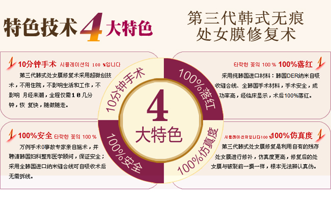 一、手术全程无痛:韩式处女膜修复术采用国际先进的镇痛技术,手术全程无痛。