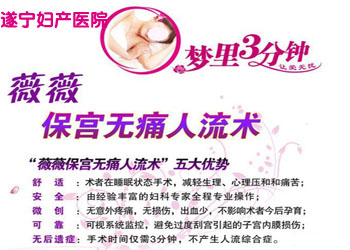 遂宁妇产医院率先引进了国际认证人流术——“薇薇”保宫无痛人流术,薇薇保宫无痛人流技术安全、高效、对子宫损伤小。特别适合于早早孕。手术时安全、高效、对子宫损伤小、减少手术并发症、降低手术事故、特别适用于早早孕。手术全程无痛,其病人在睡梦中轻松完成手术,数分钟内手术完成,术后很快恢复意识,在观察室休息1至2小时即能自行离院,不影响受术者正常的学习和工作。